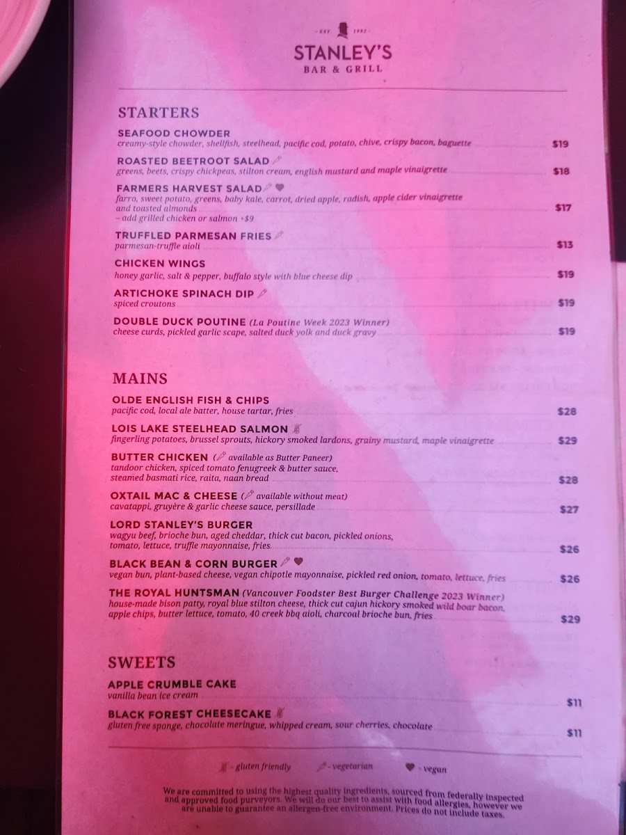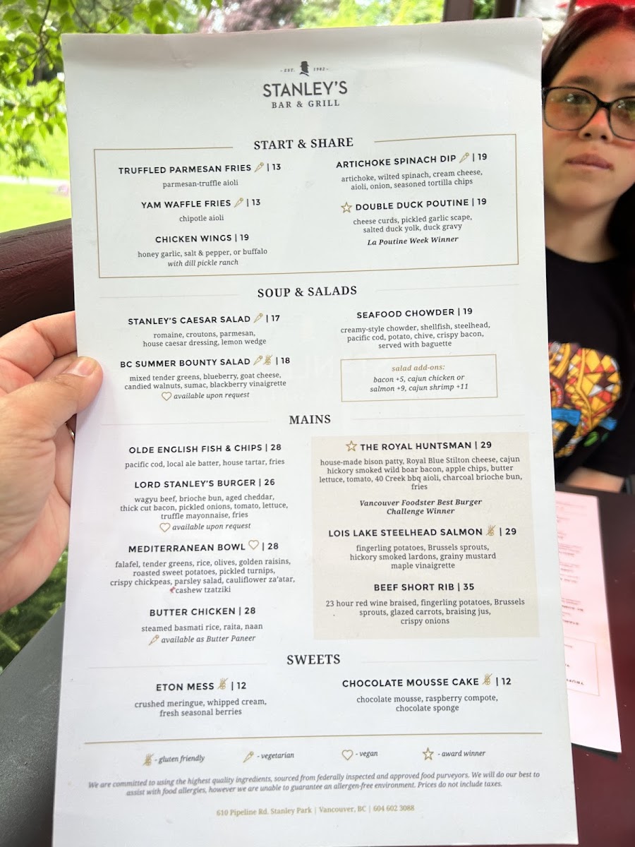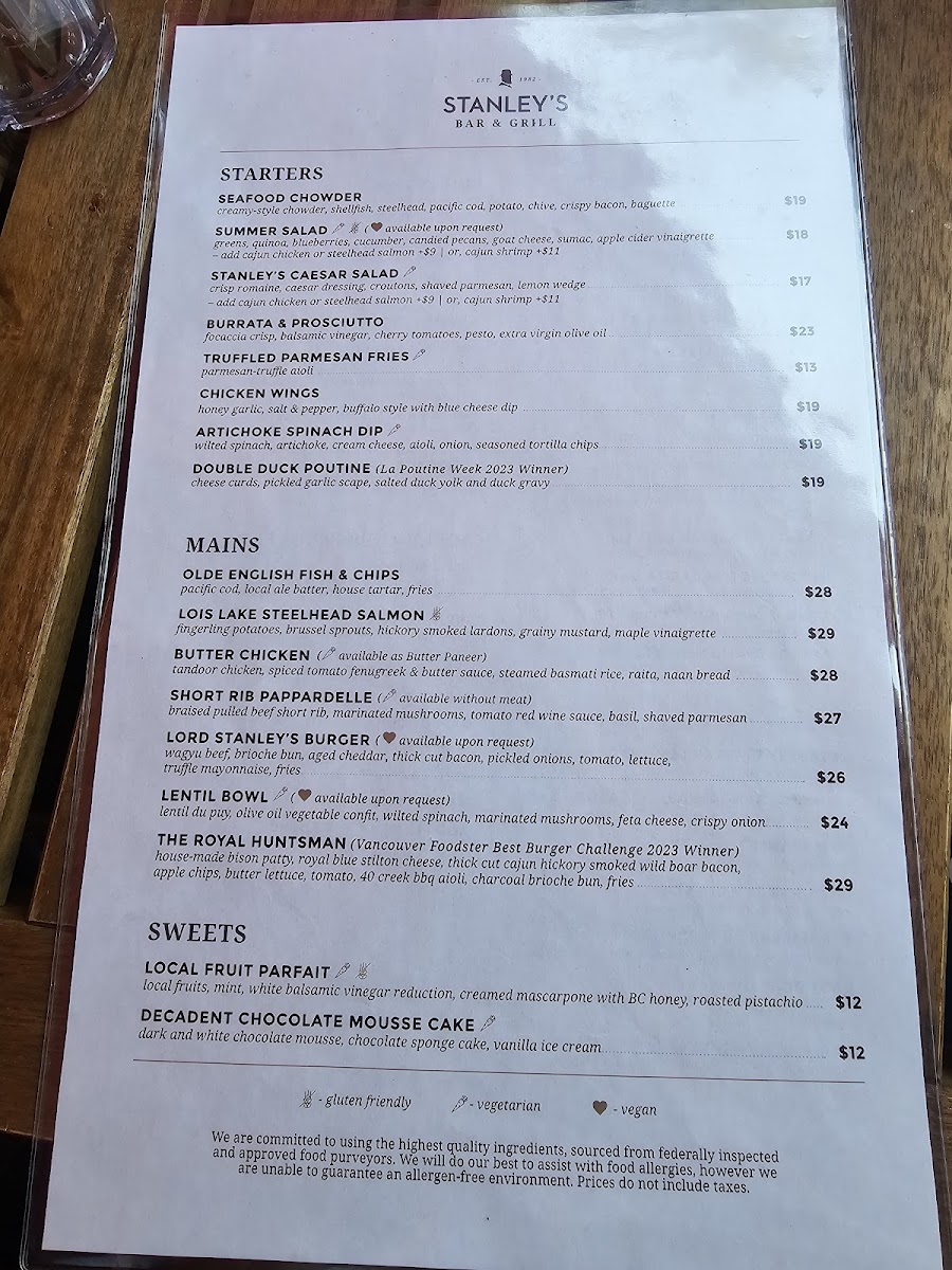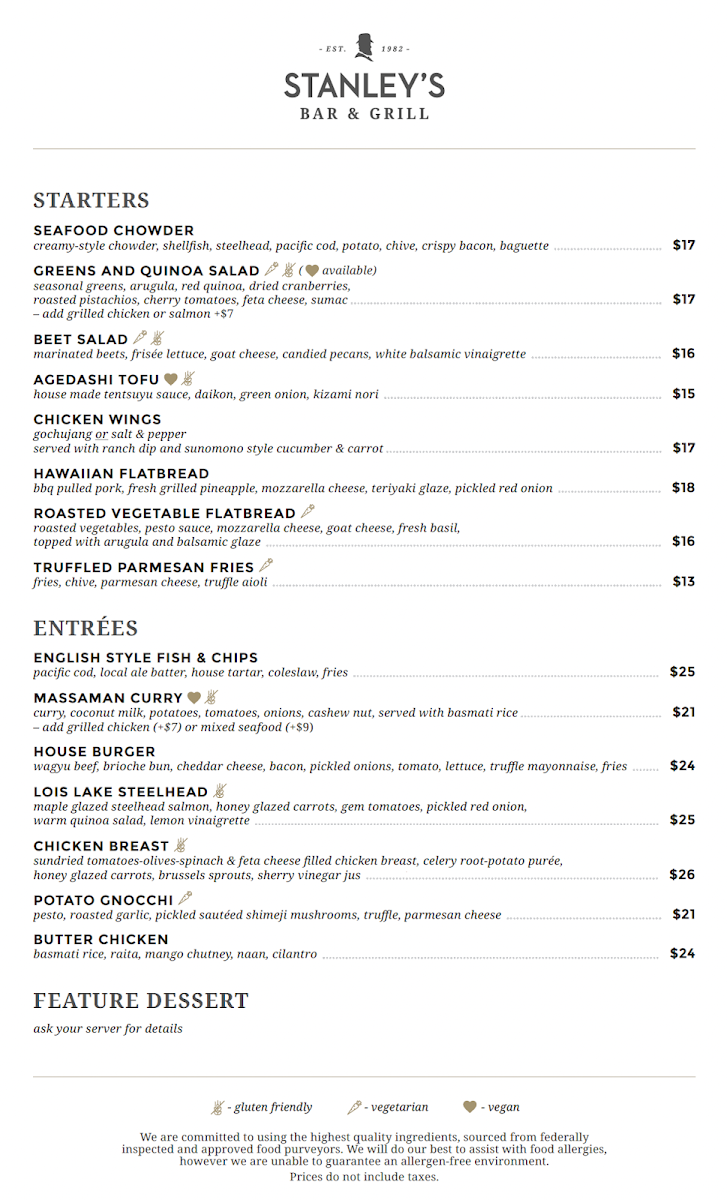 Welcome to Stanley's Bar & Grill, a culinary gem nestled in the heart of Stanley Park, Vancouver. Here, the menu reflects a delightful blend of classic and contemporary dishes, perfect for every palate. Begin your journey with the Stanley’s Caesar Salad, bursting with crisp romaine, crunchy croutons, and a rich house dressing. Dive into the Olde English Fish & Chips, featuring fresh Pacific cod, or savor the indulgent Lord Stanley’s Burger made with premium wagyu beef.